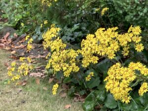 白椿と照葉のコントラストに、